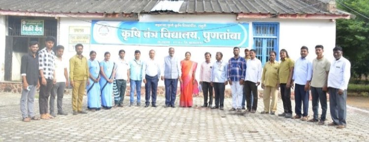 यावेळी कुलगुरु डॉ. गडाख मार्गदर्शन करताना पुढे म्हणाले की कृषि तंत्र विद्यालयात शिक्षण घेणाऱ्या विद्यार्थ्यांना विविध प्प्रकल्पाद्वारे व्यावसायिकदृष्ट्या सक्षम करण्याचा प्रयत्न कृषि विद्यापीठ करत आहे. विद्यार्थ्यांसाठी दुग्धव्यवसाय, शेळीपालन,कुक्कुटपालन, गांडूळ खत निर्मिती, मुरघास उत्पादन तसेच भाजीपाला उत्पादन, रोपवाटिका, रेशीम पालन यासारखे प्रकल्प विकसित करून विद्यार्थ्यांना भविष्यात स्वयंपूर्ण रोजगार मिळू शकेल. या प्रकल्पामधून मिळणाऱ्या उत्पन्नापैकी 50 टक्के लाभाची रक्कम ही या विद्यार्थ्यांसाठी असेल अशी सूचना त्यांनी केली. ते म्हणाले की कृषि तंत्र विद्यालय, पुणतांबा हे बीजोत्पादन कार्यक्रम यशस्वीरित्या राबवत आहे. याद्वारे शेतकऱ्यांसाठी सोयाबीन, हरभरा, कांदा यासारख्या पिकांचे उन्नत् वाणाचे बियाणे उत्पादित केले जाते. कुलगुरू डॉ. शरद गडाख यांनी कृषि तंत्र विद्यालयातील व्याख्यान कक्ष, बीजप्रक्रिया केंद्र,मुलांचे तसेच मुलींचे वसतीगृह तसेच डेअरी प्रकल्प, कांदा बियाणे रोपवाटिका आणि बिजोत्पादन प्रक्षेत्राला भेटी देऊन महत्त्वाच्या सूचना केल्या आणि मार्गदर्शन केले. यावेळी कुलगुरू डॉ. शरद गडाख आणि सौ. गडाख यांच्या शुभहस्ते वृक्षारोपण करण्यात आले. सुरुवातीला प्राचार्य डॉ. पंडित खर्डे यांनी कृषि तंत्र विद्यालयाच्या उपक्रमांचे सादरीकरण केले. या भेटीदरम्यान कृषि तंत्र विद्यालय येथील श्री. सोमनाथ लंघे, श्री. किशोर भाकरे, श्री. दिनेश पंडित, श्री. अंबादास इंगळे, श्री. सचिन राऊत आणि इतर कर्मचारी उपस्थित होते.