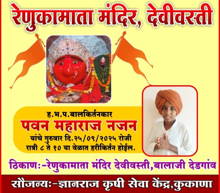 त्यानिमित्ताने आज गुरुवार 25 रोजी ह भ प बाल कीर्तनकार पवन महाराज नजन यांची कीर्तन रुपी सेवा सायंकाळी 8 ते 10 वेळेत पार पडणार आहे . तरी भाविकांनी जास्तीत जास्त संख्येने उपस्थित राहून याचा लाभ घ्यावा असे आवाहन रेणुका माता मंदिर देवस्थानच्या वतीने करण्यात आले आहे.
