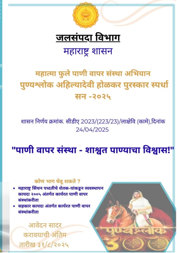 महाराष्ट्र शासनाच्या जलसंपदा विभागाचे वतीने महात्मा फुले पाणी वापर संस्था अभियान व त्या अंतर्गत पुण्यश्लोक अहिल्यादेवी होळकर पाणी वापर संस्था व्यवस्थापन पुरस्कार स्पर्धा सन २०२४-२५ करीता अभियान राबविणे बाबतचा निर्णय महाराष्ट्र शासनाने घेतलेला आहे. राज्यातील सर्व कार्यान्वित पाणी वापर सहकारी संस्था, पाणी वापर संस्था यांनी या पुरस्कार स्पर्धेत सक्रीय सहभाग घ्यावा असे सूचित करण्यात आलेले आहे. या स्पर्धेसाठी नाशिक, अहमदनगर जिल्ह्यातील इच्छुक पाणी वापर संस्थांनी दि.३१ ऑगस्ट २०२५ पूर्वी ऑनलाईन नामांकने (प्रस्ताव) दाखल करावीत.