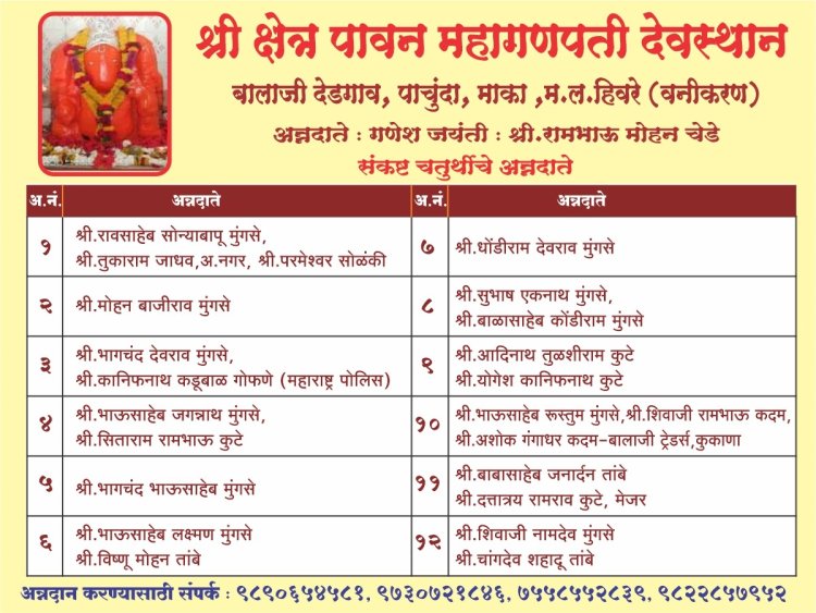 नेवासा तालुक्यातील देडगाव, पाचुंदा, माका ,म.ल.हिवरा परिसरातील पावन महागणपती देवस्थानचा भव्य उत्साहाचे आयोजन सालाबाद प्रमाणे गेली 27 वर्षापासून अखंड गुरुवर्य शांतीब्रह्म भास्करगिरी महाराज, स्वामी प्रकाशानंदगिरी महाराज ,महंत सुनीलगिरी महाराज , गुरुवर्य आदिनाथ महाराज शास्त्री यांच्या आशीर्वादाने व ह भ प सुखदेव महाराज मुंगसे, ह भ प सदाशिव महाराज पुंड यांच्या अधिपत्याखाली करण्यात आले आहे.
