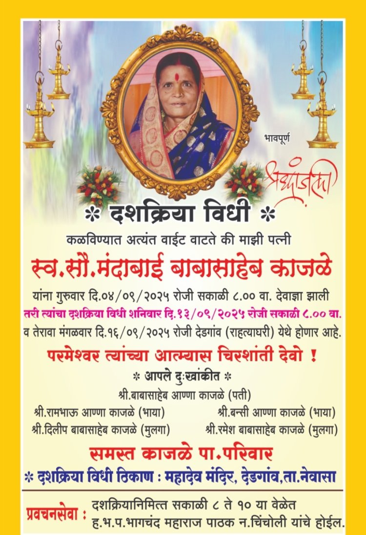 तर दशक्रिया विधी ह भ प भागचंद महाराज पाठक यांच्या कीर्तन सेवेने उद्या दिनांक १३ रोजी महादेव मंदिर देडगाव या ठिकाणी होईल. तर दिनांक १६ रोजी तेराव्याचा कार्यक्रम राहत्या घरी होईल.
